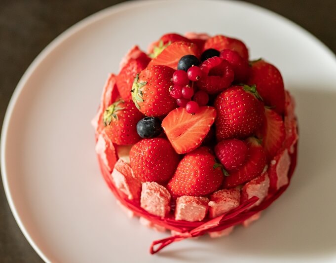 - アニバーサリーケーキ(※ピンク色のビスキュイで飾り付けしているベリーシャルロットケーキへの変更も承ります。※但し追加料金が発生いたします。)